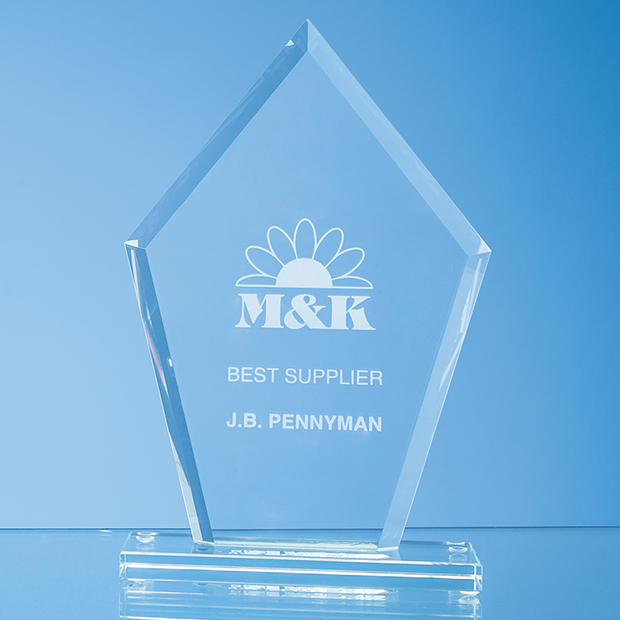 The impressive and stylish jade glass 20cm x 14.5cm Bevelled Edge Diamond Award is an ideal inexpensive recognition, achievement or incentive gift. It can be personalised with any crest, logo or wording to create an award that is sure to take pride of place when put on display at home or at work. It is supplied in a cardboard gift box.