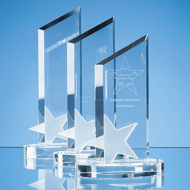 Celebrate recognition or a win with this flawless optical crystal peak award with a frosted star at the base. Available in three sizes 22cm 26cm and 30cm shown it is ideal to use as a standalone presentation recognition or award but also for 1st 2nd and 3rd place achievement whether sporting academic or corporate. With a generous area to engrave a crest company logo or message it comes in its own foam lined presentation box.