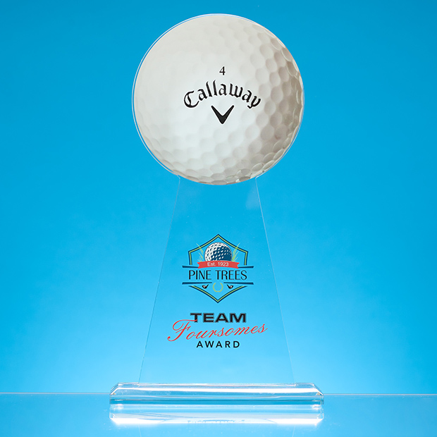 A sleek and modern clear glass award featuring a spherical ball top that can be UV printed with any round design such as a sports ball, globe, or company logo. Mounted on a solid clear glass base for a clean, premium look and supplied in a protective foam-lined gift box. Available in three sizes 10cm, 12.5cm, and 15cm diameter. Ideal for corporate awards, sports presentations, and special recognition.