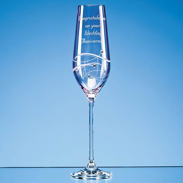 An elegant long stemmed champagne flute with a romantic pink tint is the perfect gift or memento for an engagement wedding birthday or anniversary. Finished beautifully with a delicate spiral cut pattern and three sparking Swarovski Diamante crystals there is space to personalise this gift with the engraving of an inscription message or date. To make it extra special why not order with a beautiful presentation box lined with satin