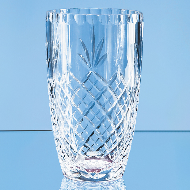 Say it with flowers. This beautiful 23cm lead crystal panelled barrel vase will grace any sideboard mantelpiece or awards cabinet with elegance and charm. With a classic diamond and wedge cut design and incorporating space to engrave a special message logo or crest it doubles as a corporate recognition award sports trophy or to commemorate a special event or occasion - whether a birthday retirement anniversary. Available as an option is a beautiful presentation box with blue satin lining.