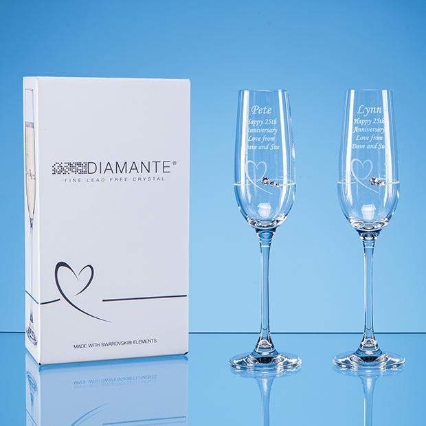 Spread a little love with these beautifully designed champagne flutes. Each glass features a heart design which encompasses the full circumference and is enhanced with a series of diamante crystals. There is plenty of space for you to add an engraved message to share with a loved one or to present to a happy couple on their special day. The flutes are supplied in an attractive Gift Box.